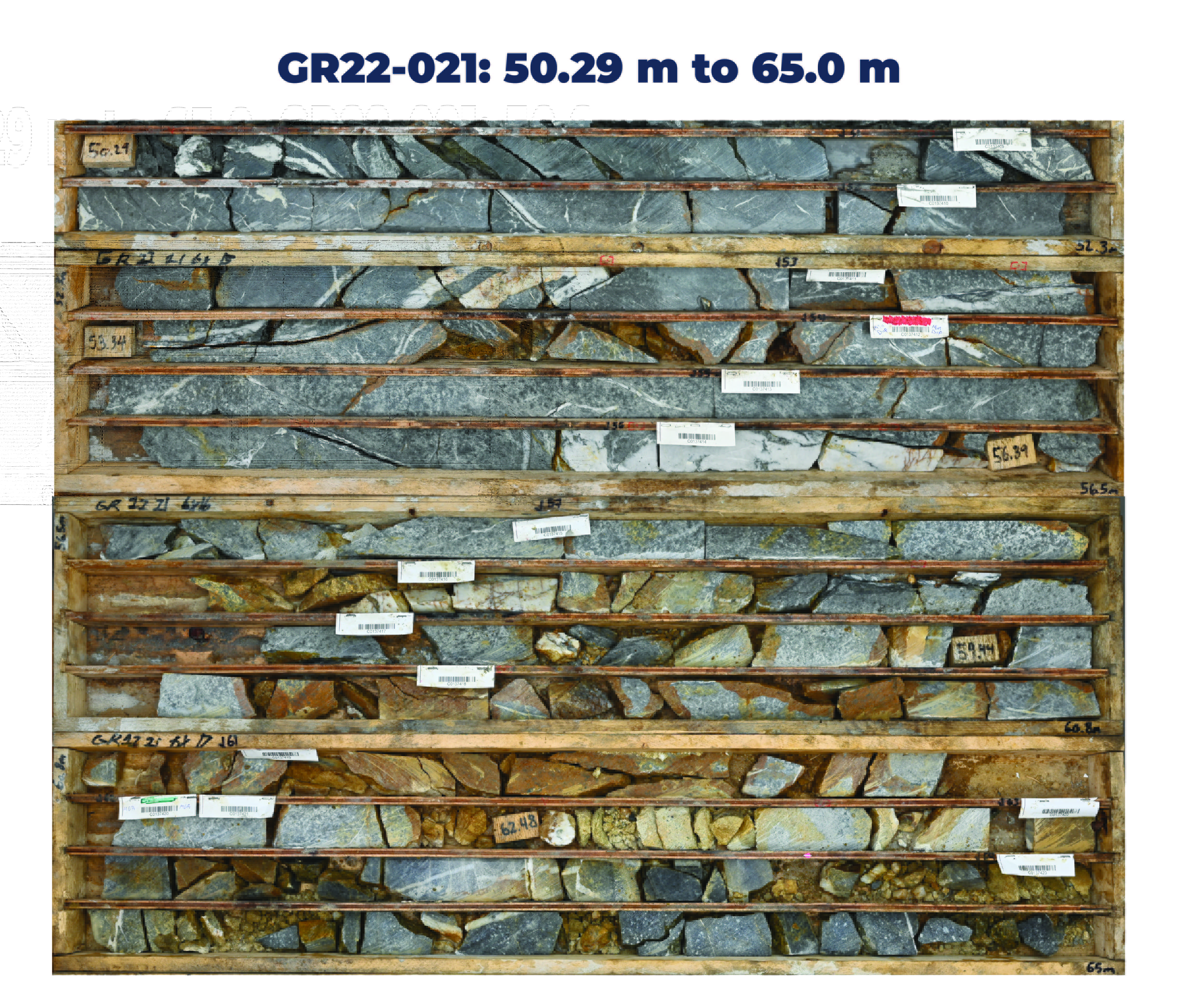 Once completed, the drill will move to the Eastern Target Area where it will continue to test the promising intrusive hosted mineralization intersected in GR22-021 and GR22-022. Future drilling will be completed from the same pad as GR22-022 and then step out drilling will occur to the east and west.