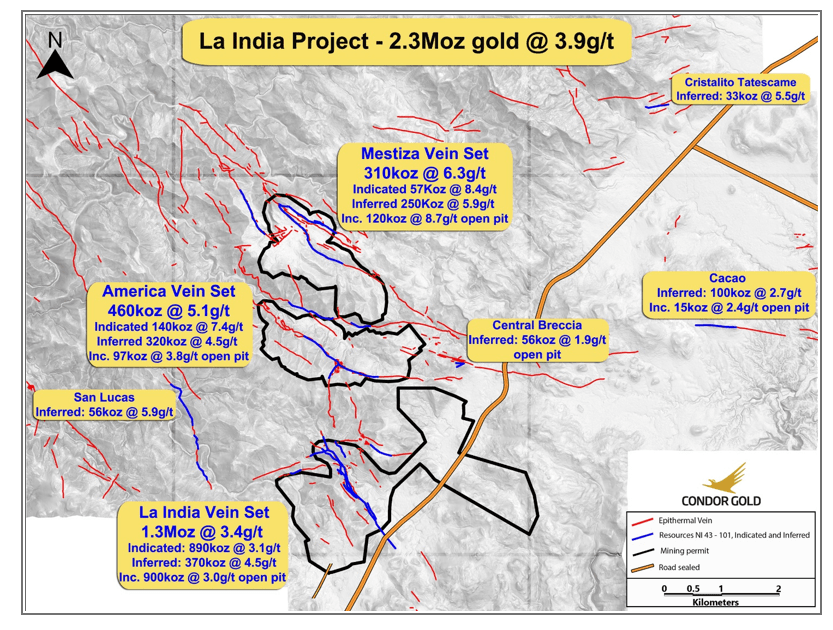 Environmental Permits were granted in April and May 2020 for the La Mestiza and America open pits respectively, both located close to La India. The La Mestiza open pit hosts 92 Kt at a grade of 12.1 g/t gold (36,000 oz contained gold) in the Indicated Mineral Resource category and 341 Kt at a grade of 7.7 g/t gold (85,000 oz contained gold) in the Inferred Mineral Resource category. The America open pit hosts 114 Kt at a grade of 8.1 g/t gold (30,000 oz) in the Indicated Mineral Resource category and 677 Kt at a grade of 3.1 g/t gold (67,000 oz) in the Inferred Mineral Resource category. Following the permitting of the La Mestiza and America open pits, together with the La India Open Pit Condor has 1.12 M oz gold open pit Mineral Resources permitted for extraction.