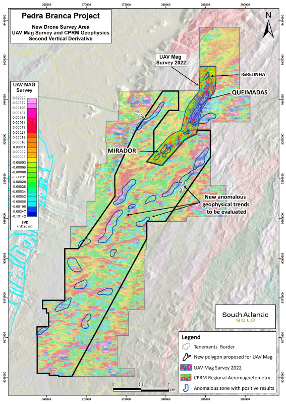 As released June 13, 2022 (click here to view release), the high resolution drone survey at 50-meter line spacing was successful in the identification of magnetic signatures over the current resource area (Igrejinha, Queimadas and Mirador). This information along with the results from Phase I, Phase 2, the geophysical study, and the magnetic survey from Companhia de Pesquisa de Recursos Minerais (“CPRM” or “Geological Survey of Brazil”) at a resolution of 500-meter line spacing, formed the base data for target prioritization and selection of initial reconnaissance drilling.