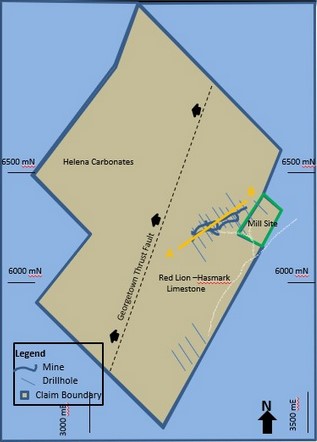 The 22 Golden Jubilee claims (Figure 2) are situated in Granite County, Montana USA and have had a number of previous owners. There has been only limited exploration and mining on a vein located on the Red Lion Line, which is a structure known to continue over a regional strike of 7 km in length. The Golden Jubilee Mine is located in mountainous country at an elevation of approximately 2,350 m.