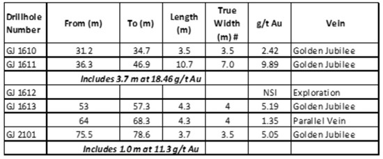 The Company has recommenced its first drilling campaign into the Golden Jubilee deposit after reporting five assay results in March 2022, including Hole 1611 10.7 metres at 9.9 g/t Au (including 3.7 m at 18.46 g/t Au) (Table 1). The Company is fully funded to complete this program with an additional 2,000 metres planned to be drilled. The mineralization has been interpreted down dip and along strike from previous intersections and the assay results provide sufficient encouragement to engage in further drilling. Exploration Permits have been received to allow further holes to be drilled once this 2,000m is complete. The gold mineralization intersected by the diamond drilling is within an iron rich replacement and sulphides zone and shear; along with associated quartz. Some characteristics of the mineralization include:-