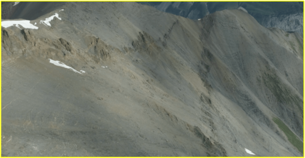 The above photo taken from a video clip of a UAV drone mission over the Toro Vein copper structures as seen in the mountain wide dark copper mineralized banding.
