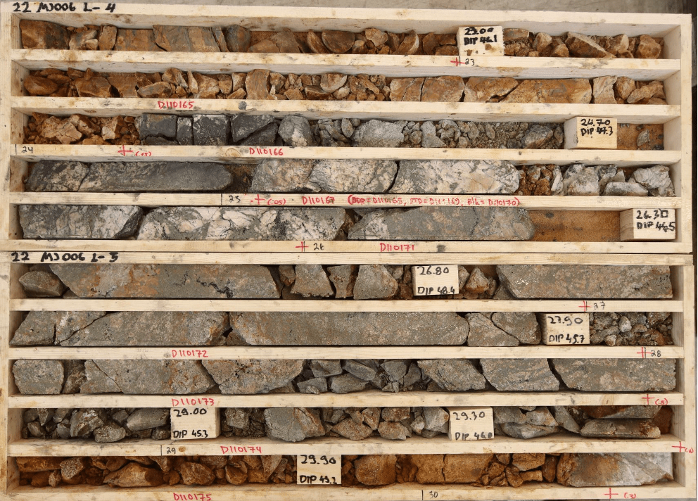 Figure 2 – Photo of drill core (sawed) from hole 22MJ006 – 24m to 30m down hole. (Click HERE for full sized image)