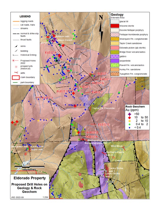 High-grade gold mineralization in similar listwanite-bearing rocks on the southern portions of the same north-northwest, regional fault structures is being successfully targeted by Endurance Gold Corporation on their Reliance Gold project, located 14 kilometres to the southeast. Tempus Resources Ltd. is successfully targeting similar orogenic gold mineralization on the Elizabeth Gold Project, located 25 kilometres east of Eldorado, and hosted in similar geological units (Late Cretaceous diorite intruding ultramafic rocks). Talisker Resources are actively expanding resources at the Bralorne mine and exploring a wide area east and north of the Eldorado claim block (see Map 2).