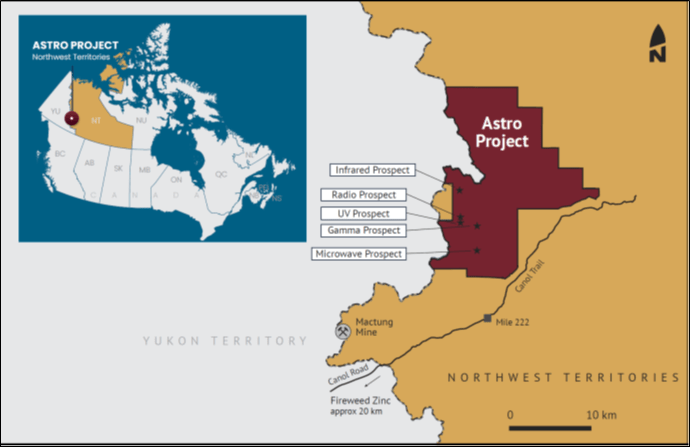 The Astro Project is a 288 square-kilometre exploration property located in the Northwest Territories along the Yukon border close to the Canol Road. The property contains outcropping gold mineralization in a ten-kilometre-long structural corridor. Gold mineralization is developed within and flanking the hornfelsed aureole of the Border granodiorite pluton. Identified gold mineralization consists of gold-arsenic-antimony bearing quartz veins, gold- bismuth skarn and gold associated with disseminated sulphides in siltstone. Known gold showings exhibit structural control along a series of northwest-striking faults down dropping hornfels and sedimentary rocks on the east side of the Border pluton.