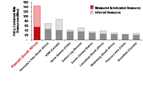 Source: company filings, S&P Global Market Intelligence. Notes: Chart ranks the largest undeveloped primary palladium, platinum, gold, silver and rhodium projects from the S&P Global Market Intelligence database based on measured and indicated palladium equivalent resource. Palladium equivalent calculation includes palladium, platinum, gold, silver and rhodium ounces and has been calculated using spot price metal price assumptions (February 23, 2022) of US$1,095/oz. platinum, US$2,480/oz. palladium, US$18,750/oz. rhodium, US$1,909/oz. gold and US$24.55/oz. silver. Measured and Indicated resources for Platreef correspond to palladium, platinum, gold and rhodium ounces at a 1 g/t cut-off grade.