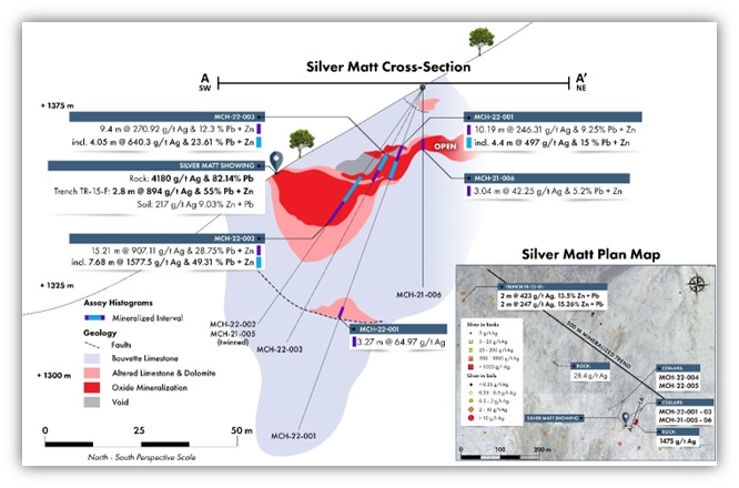 Initial drilling at the Silver Matt zone was completed using a Reverse Circulation drilling in late summer of 2021. Oriented to drill under the 2015 trench, hole MCH-21-005 intersected a broad zone of oxide mineralization over 19.8m of 556 g/t Ag, 20.3% Pb, 3.16% Zn, including 7.6m of 824ppm Ag, 28.7% Pb, 1.54% Zn