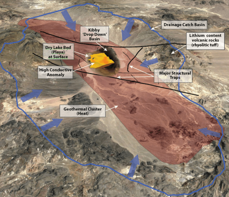 The Kibby Basin Lithium Project has similar features as Clayton Valley, Nevada and contains potential favourable conditions for the development of lithium‐rich brines and sediments such as; an arid climate, major catch basin, basin has structural traps and is closed, associated igneous or geothermal activity, suitable lithium source rocks and one or more adequate aquifers.