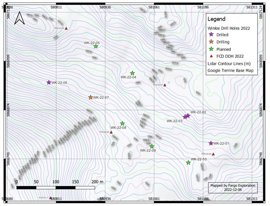 Hole WK-22-03 was drilled vertically from the same drill collar as hole WK-22-02. The drill core from WK-22-03 has been sent to Base Metallurgical Laboratory in Kamloops for a scoping level metallurgical analysis involving hardness and grindability and to assess the metallurgical performance of samples using conventional flotation processes. The data will be used to help guide the selection of metallurgical testing to develop a viable recovery process.