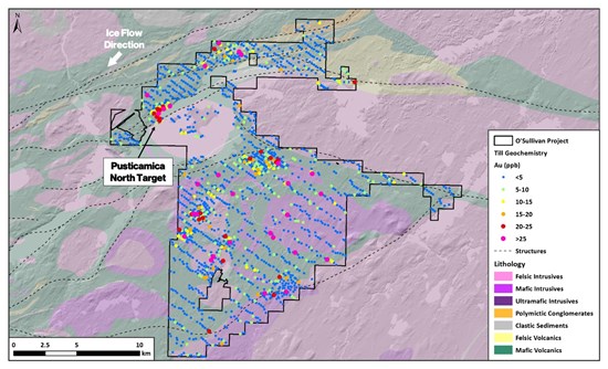 Figure 2. Property Map of the O’Sullivan Project with Gold-in-till Geochemical Results