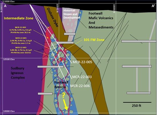 Four drillholes, MCR-22-003 to MCR-22-006, targeted the 101 zone below historical mining. This area was not a focus of previous Lonmin Canada Inc. (“Loncan”) drilling as it is not considered a low-sulphide, high PGE system. The 101 FW Zone consists of disseminated to locally massive sulphide, hosted within a footwall breccia system, extending southwest into the footwall of the Intermediate Zone (Figure 3 and 4). Sudbury footwall orebodies are commonly hosted within breccia systems, and often are elevated in Ni, Cu and PGE mineralization, relative to typical SIC contact mineralization. Drillhole MCR-22-003 was targeting below and adjacent to historically mined stopes and confirms the mineralization continues down-dip and along strike to the southwest. The drillhole intersected approximately 70 m of footwall breccia, with local disseminated to stringer mineralization throughout. Significant assay results received to date include 3.8% Ni, 1.8% Cu, 0.5 g/t Pt+Pd+Au over 10.8 metres. The 101 FW Zone breccia system remains open for exploration and expansion to the southwest and down-dip of the historical mining. In addition to the 101 FW Zone, Drillhole MCR-22-003 intersected 0.7% Ni, 0.4% Cu, 0.6 g/t Pt+Pd+Au over 30.2 metres, including 1.1% Ni, 0.6% Cu, 1.4 g/t Pt+Pd+Au over 10.5 metres within the Intermediate Zone at the base of the Sudbury Igneous Contact (“SIC“).