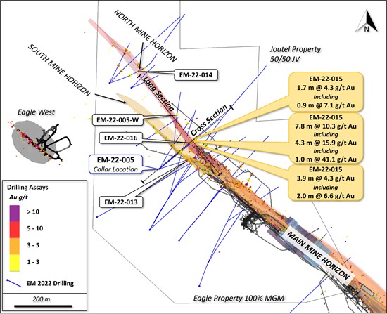 Key assay results reported herein are from holes drilled at different orientations from the site of hole EM-22-005 (see news from June 20, 2022); three (3) starting from the same drill collar (EM-22-013, EM-22-015, EM-22-016) and one (1) wedge drill hole (EM-22-005W). The new results from EM-22-015 support the Company’s model of multiple sub-parallel gold horizons, some of which are particularly high-grade (>10 g/t), extending from the southern splay of the main mine horizon (the “South Mine Horizon”) to beyond the North Mine Horizon over a mineralized corridor that now exceeds 100 m in width. These two horizons merge into a single main mine horizon in the central part of the Eagle property (see Figure 1).