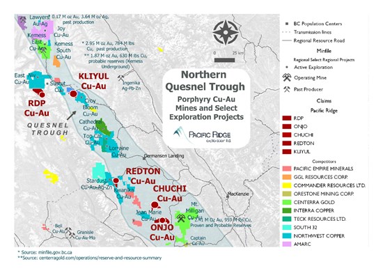 Our goal is to become British Columbia’s leading copper-gold exploration company. Pacific Ridge’s flagship project is the Kliyul copper-gold project, located in the prolific Quesnel Trough, approximately 50 km southeast of Centerra Gold Inc.’s Kemess mine. In addition to Kliyul, the Company’s project portfolio includes the RDP copper-gold project (optioned to Antofagasta Minerals S.A.), the Chuchi copper-gold project, the Onjo copper-gold project, and the Redton copper-gold project, all located in British Columbia.