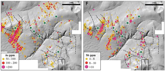 South of the drill-confirmed Thesis Structural Corridor there is a significant geochemical footprint of coincident molybdenum, tungsten, antimony, and silver anomalies that spans approximately 2 km by 1.6 km. This zone also contains localized anomalies of arsenic, lead, and zinc and coincides with mapped vuggy silica alteration that is known to be associated with precious metal mineralization at Ranch (Figure 2). Further, an approximately 2.6 km by 1 km strongly molybdenum-enriched footprint is present between the Ridge and Steve zones that also contains coincident tungsten, antimony, and silver anomalies (Figure 2). This geochemical anomaly is positioned between parallel N-S structures and extends north and south of their intersection with a NW-trending structure. Within other parts of the Ranch property, this type of structural environment has proven favorable for gold mineralization.