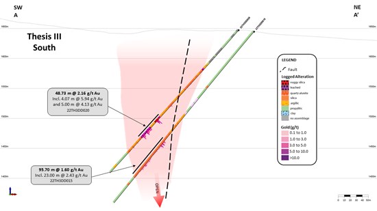 The Thesis Structural Corridor comprises the Thesis 2, Thesis 3, and Bingo zones. The Corridor is characterized by a km-scale NW-SE trending magnetic low that is crosscut by numerous NE and N-S trending structures. Drilling at Thesis 3 continues to return broad intervals of epithermal gold mineralization within leached and vuggy silica-altered andesitic volcanic rocks that often coincide with northwest oriented faults. The broad magnetic low and significant intervals of argillic- and silicic-altered volcanic rocks at the Thesis Structural Corridor are likely a representation of prolonged fluid flow and host rock alteration along faults and fractures that acted as fluid pathways at the time of gold mineralization.