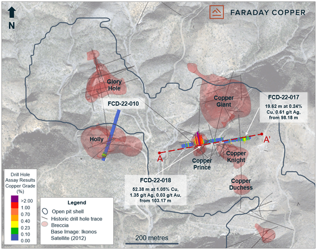 - Intersected 52.38 metres (“m”) at 1.05% copper and 1.35 grams per tonne (“g/t”) silver from 103 m at the Copper Prince breccia in drill hole FCD-22-018, improving the confidence in the continuity of near-surface mineralization within the open pit mineral resource (Table 1, Figures 1, 2); and