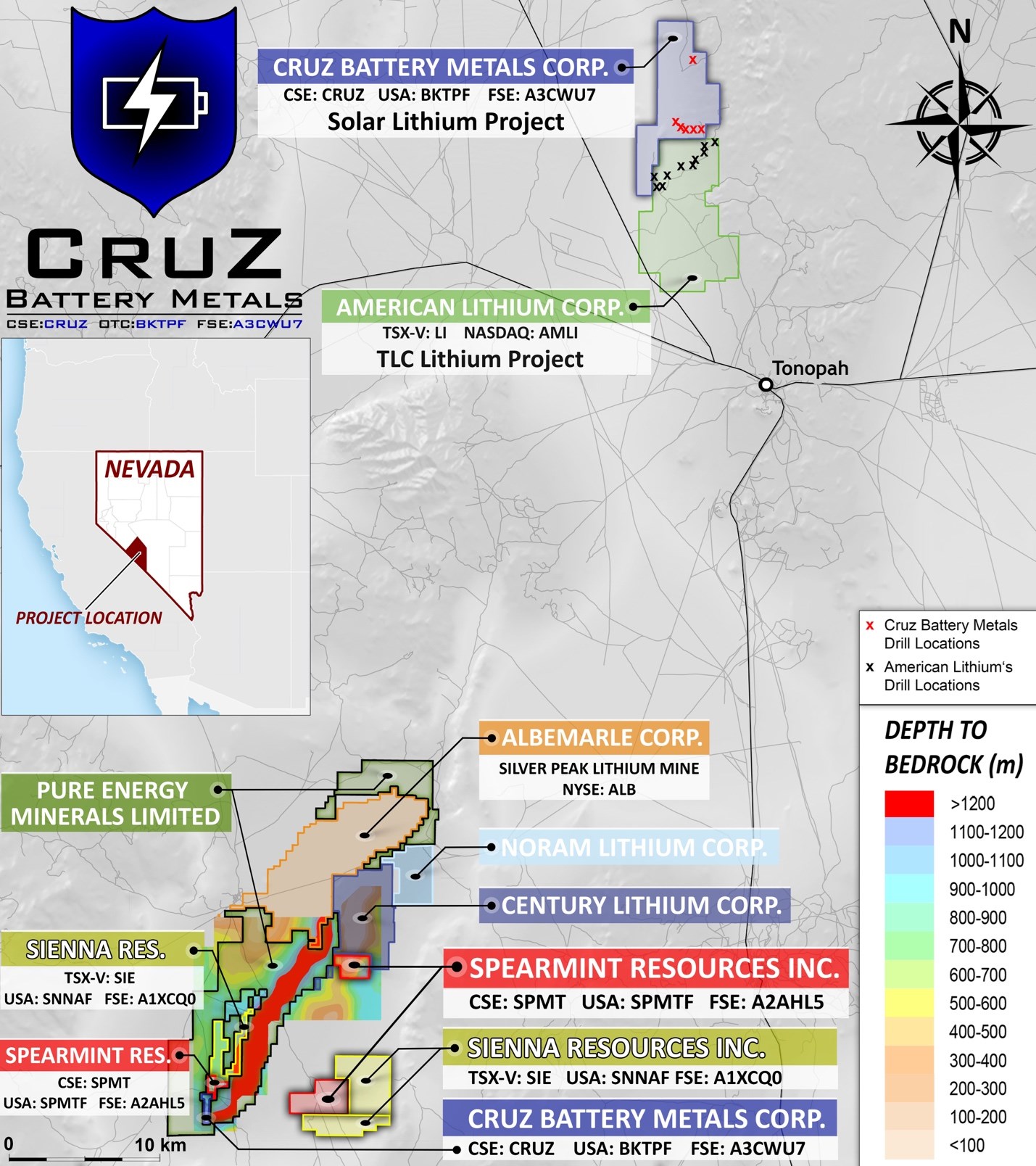 Vancouver, British Columbia–(Newsfile Corp. – February 27, 2023) – Cruz Battery Metals Corp. (CSE: CRUZ) (OTC Pink: BKTPF) (FSE: A3CWU7) (“Cruz” or the “Company”) wishes to announce the phase-3 drill program comprising four core holes has now been completed on the 100-percent owned, 8,135-acre Solar Lithium Project in Nevada, directly bordering American Lithium Corp.’s TLC project (See map below).