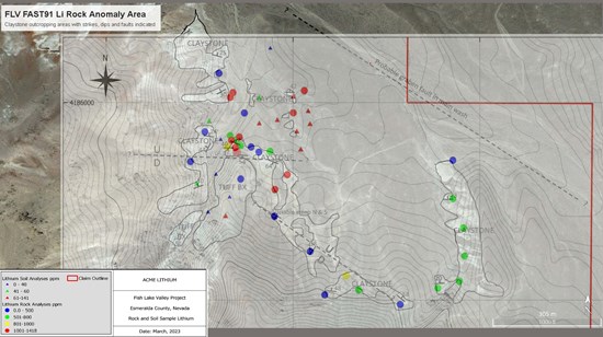 Carson City, Nevada–(Newsfile Corp. – March 13, 2023) – ACME Lithium Inc. (CSE: ACME) (OTCQX: ACLHF) (the “Company”, or “ACME”) is pleased to report that its recent Phase 2 geological field review and sampling program at Fish Lake Valley, Nevada has resulted in numerous new occurrences of lithium values exceeding 1200 ppm lithium with the highest surface value to date at 1418 ppm lithium. Boron anomalies up to 1964 ppm occur with and adjacent to surface lithium anomalies. See results in link to table below.