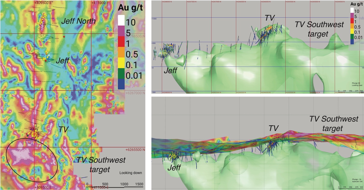 (Figure 7. Magnetic tilt derivative map (left) and 1000 m thick long sections of the magnetic susceptibility model (right) for the TV-Jeff VMS trend. Long sections are centered around line 409500 E, with the upper one viewed looking due west, and the lower one viewed obliquely and from below the surface. Gold assay results for drill holes, and rock chip samples (circles) are shown. Zones of intense hydrothermal alteration (an Ishikawa alteration index greater than 80) are modeled as light blue volumes in the upper long section. As with Eskay Creek and Lulu, mineralization and hydrothermal alteration are closely associated with protrusions in the modeled magnetic susceptibility volume, with more pronounced protrusions correlating with stronger mineralization at TV and Jeff. The smaller protrusions in magnetic susceptibility between TV and Jeff correspond with zones of anomalous Au and Ag mineralization found with rock chip sampling and drilling. Prospective magnetic anomalism continues to the south and west of TV, supporting the interpretation of our geological team that sulfide mineralization at TV may extend in this direction based on encouraging results from drill holes TV22-108.)