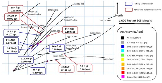 MA23C-010 intersected 0.070 oz/ton Au over 54.1 feet (2.40 grams/tonne over 16.5 meters) and 0.107 oz/ton Au over 14.2 feet (3.68 grams/tonne over 4.3 meters) within Precambrian hosted Tertiary breccias. MA23C-010 was designed to test the Unionville Zone north of MA22C-009.