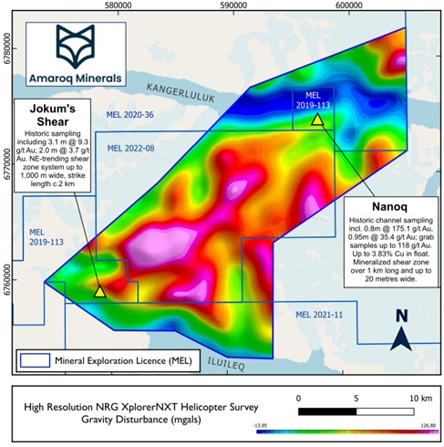 Further regional work completed by Amaroq indicated the existence of a ~25km long controlling structure linking Nanoq to the Jokum’s Shear project to the South West.