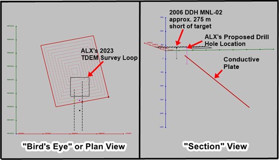 Sabre consists of 16 mineral claims owned 100% by ALX encompassing 16,041 hectares (39,637 acres), located along the northern margin of the Athabasca Basin near Richards Lake, SK, approximately 60 kilometres (40 miles) west of Stony Rapids, SK. In September 2022, two radioactive zones were mapped on surface in the Athabasca sandstone by ALX’s prospecting team adjacent to an interpreted structural zone of quartz vein brecciation (see ALX news release dated October 25, 2022). In January 2023, ALX carried out a ground TDEM survey at Sabre and defined a previously untested airborne geophysical conductor near a 2006 drill hole that had demonstrated a significant dravite (boron) anomaly in the Athabasca Formation sandstone. Computer modeling of the 2023 TDEM conductor showed that the historical drill hole missed the conductor by approximately 275 metres, as shown in Figure 2 below: