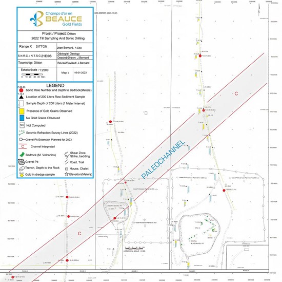 A sampling program by the Company recovered gold from every sample taken throughout the Ditton quarry (BGF press release January 20, 2022), bringing about the discovery of the Ditton placer gold channel. Further insights to the existence of a channel were gained from the 1980s historical exploration reports of the regional geology and geophysics. It also revealed that the quarry was an excavated pit of an exposed layer of a Tertiary placer channel. Results from the company’s 2022 seismic refraction survey lines further support the existence of a paleochannel.