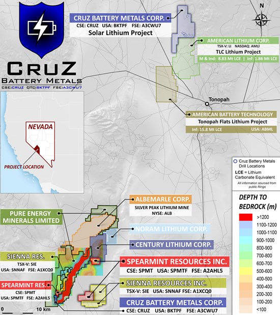 Vancouver, British Columbia–(Newsfile Corp. – May 29, 2023) – Cruz Battery Metals Corp. (CSE: CRUZ) (OTC Pink: BKTPF) (FSE: A3CWU7) (“Cruz” or the “Company”) wishes to announce that the phase-4 drill program is now underway on the 100-percent owned, 8,135-acre Solar Lithium Project in Nevada, directly bordering American Lithium Corp.’s TLC project (see map below). To date, the Company has now discovered the presence of lithium in every drill hole during the phase 1, 2 & 3 drill programs.