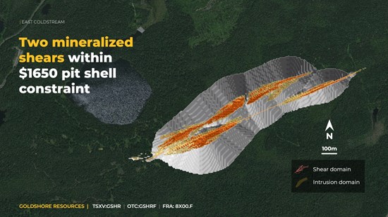 Sixteen new drill holes, totaling 7,973 m, were drilled in the East Coldstream Deposit to gather the required geological understanding of the deposit. Mineralization was modeled by CSA Global guided by alteration wireframes provided by Goldshore. Implicit modelling techniques were utilized in wireframing a NE-trending shear zones carrying higher-grade gold mineralization which is subdivided into two parallel domains (Z-2 and Z-4), and two satellite subparallel lenses (Z-1 and Z-3). A lower grade wireframe was developed surrounding the shear zone domains representing mineralization associated with more brittle-style veining in the felsic to intermediate metavolcanic rocks, gabbros, and porphyries between the main shear zones.