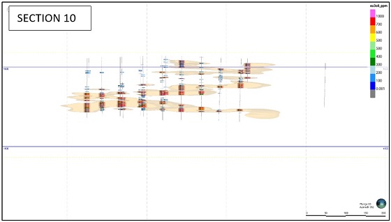Figure 2: Sections 10, 17 and 22 demonstrates that the mineralisation is still open along each section for several 100 metres, both up dip (to the left) and down dip (to the right), and requires additional drilling.