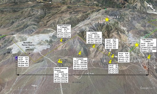 As reported in the Company’s February 22, 2023 press release, many grab samples collected during the October 2022 exploration program returned gold, silver and base metal values greater than the upper limit of the chosen analytical method. Samples with metals values above analytical limits were reassayed. The results confirm high-grade base and precious metal abundances along a 3.82 km strike extending from the reclaimed Parton Quarry area to the area near the historic underground precious metals workings in the Look Out area (Figure 1). Even though metal abundances vary considerably between individual samples, high-grade assays of the following metals are: total gold assays range up to 75.1 grams per tonne, silver up to 3,680 grams per tonne, copper up to 6.93%, lead up to 24.2% and zinc up to 24.2%. Dykes and sills identified at some prospects are mineralized along with the adjacent carbonate.