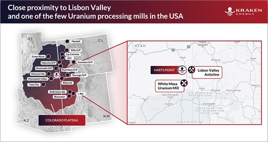 Vancouver, British Columbia–(Newsfile Corp. – May 2, 2023) – Kraken Energy Corp. (CSE: UUSA) (OTCQB: UUSAF) (the “Company” or “Kraken“) is pleased to announce that it has entered into a binding letter of agreement (the “Agreement“) to acquire up to a 75% interest in the Harts Point Uranium Property (Figures 1 & 2) in San Juan County, southeast Utah (“Harts Point” or the “Property“). The Property is located in the center of the Colorado Plateau, referred to by some as “the US version of the Athabasca Basin,” and is 64 kilometers (“km”) (40 miles) north of the White Mesa Uranium Mill, the only fully licensed and operating conventional uranium mill in the United States.