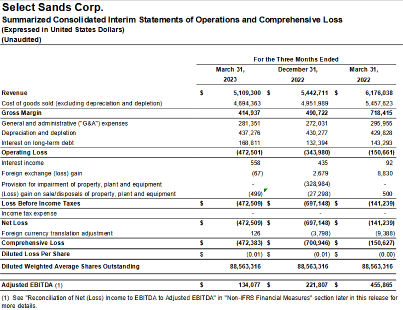 MAY 30, 2023 – TheNewswire – HOUSTON, TX, USA – Select Sands Corp. (“Select Sands”, “We” or the “Company”) (TSXV:SNS), (OTC:SLSDF) today announced operational and financial results for the three months ended March 31, 2023 (“Q1 2023”), and the filing of its financial statements and associated management’s discussion and analysis on www.sedar.com. All dollar references in this release are in U.S. dollars.