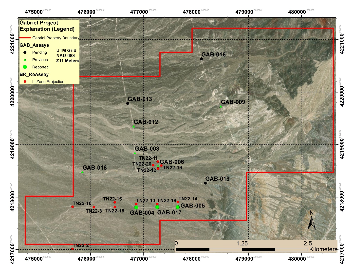 Bordering American Lithium Corp.’s TLC deposit, Gabriel shows similar lithium-bearing lithologic horizons and similar potential to host a significant lithium deposit immediately adjacent to a major highway, US95, and just outside of the town of Tonopah. There is no assurance that mineralization comparable in size or scale to that on adjacent properties will be discovered on Gabriel.