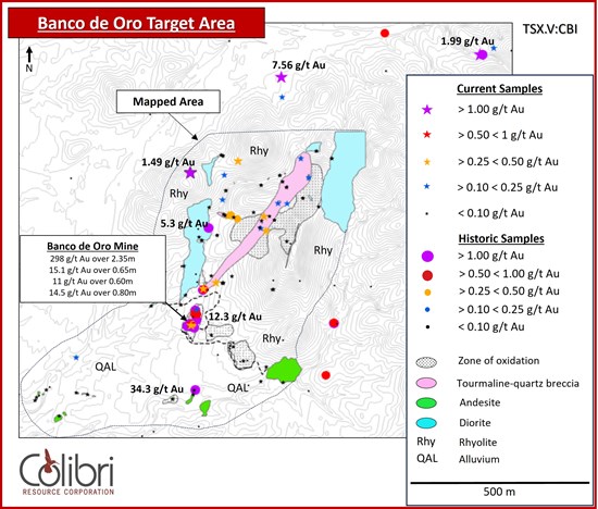 Numerous historical surface grab samples > 1 g/t, including 5 samples > 5 g/t Au, from the Banco de Oro target area form a north-northeast trend over an approximately 1 km distance. Reconnaissance level field work completed by Colibri during it due diligence process returned 7.56 g/t Au and 1.99 g/t Au from grab samples along this northeast trend (see illustration 2).