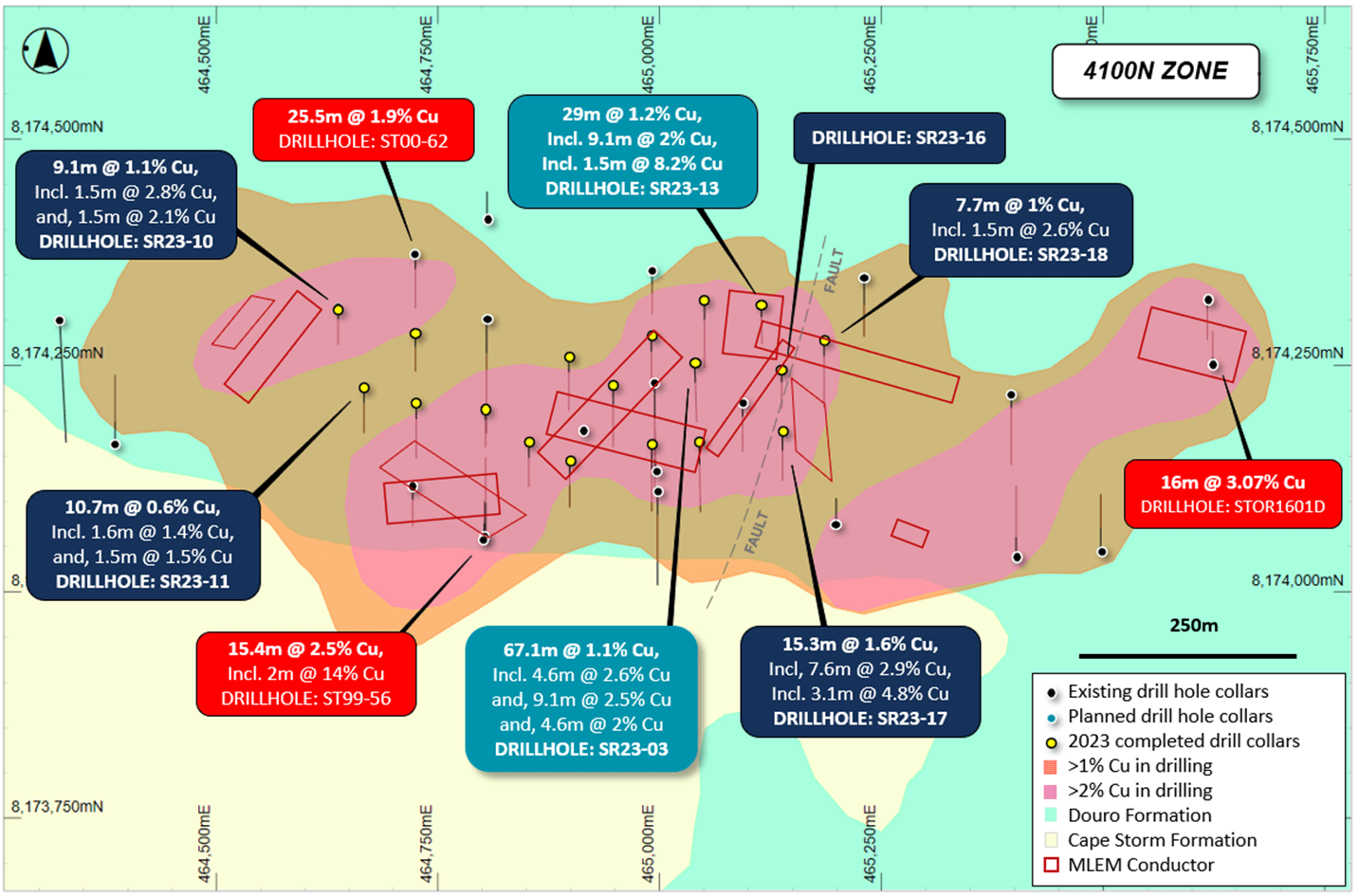 All drill holes along the northern extent of the known 4100N Zone (including SR23-12) have intervals of strong copper mineralization and are open to the north where MLEM data supports potential extensions to the mineralization in this direction.