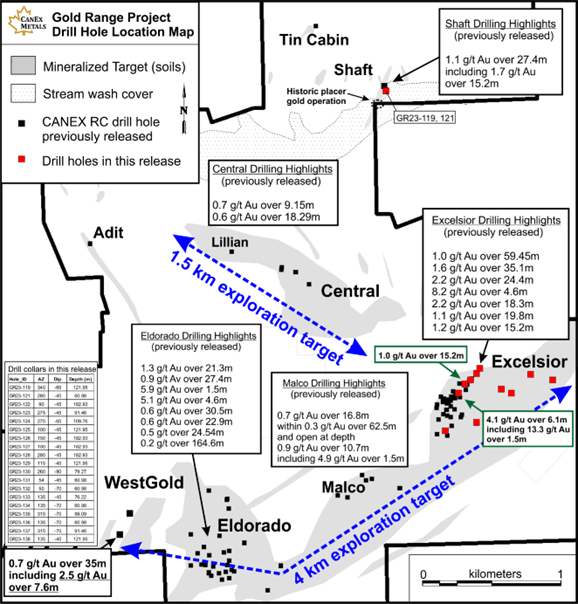 CALGARY, AB / ACCESSWIRE / July 5, 2023 / CANEX Metals Inc. (“CANEX” or the “Company”) is pleased to announce results from 19 reverse circulation drill holes from multiple targets across the Gold Range Project, Arizona. This drilling has intersected strong gold mineralization within the Excelsior Zone and demonstrates a new area with good gold potential at East Excelsior, located immediately east of Excelsior.