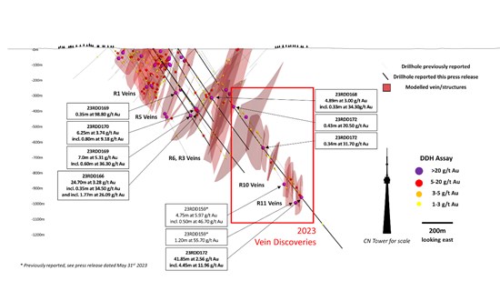 23RDD172: 2.56 g/t Au over 41.85m incl. 11.96 g/t Au over 4.45m at R11 (new vein discovery)