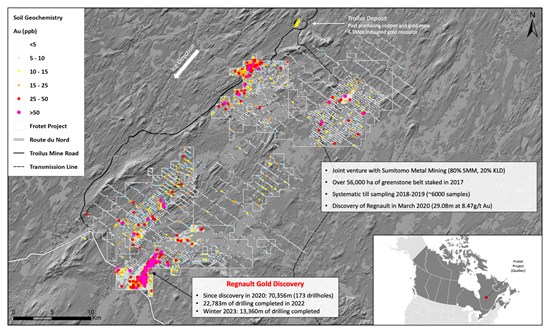 The Frotet Project was first identified by Kenorland in 2017 after completing a regional prospectivity study over the Abitibi and Frotet-Evans Greenstone Belts of Quebec. The initial 55,921 ha property was acquired through map staking in March 2017 and optioned to Sumitomo Metal Mining Canada Ltd., a wholly owned subsidiary of Sumitomo Metal Mining Co., Ltd. in April 2018. Two years of property-wide systematic till sampling led to a maiden drill program in 2020 which resulted in a significant grassroots discovery at the prospect now named Regnault. The project is currently under the Joint Venture agreement between SMMCL and Kenorland Minerals Ltd., with interests being held at 80% and 20%, respectively. Under the Joint Venture, exploration is funded pro-rata and Kenorland is presently the operator of the project. Any party which does not contribute and is diluted below a 10% interest, converts its interest to an 2% uncapped net smelter royalty.