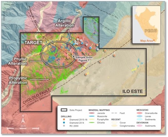 Geochemical mapping and sampling are underway at Ilo Este (Figures 6-8). Analysis of WV-3 satellite imagery in conjunction with previous data has focused exploration on a relatively unexplored western area of Ilo Este. An exposure of porphyritic quartz diorite with strong potassic alteration containing copper oxide minerals was located in an area previously untested by drilling (see Figures 7 & 8). Drill permitting will initiate shortly.