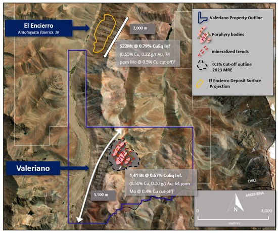 Valeriano and the adjacent El Encierro Project (Antofagasta/Barrick JV) which hosts a 522 Mt Inferred Resource (0.65% Cu, 0.22 g/t Au, 74 ppm Mo at 0.5% Cu cut-off (Antofagasta June 2022)) are linked within a large alteration zone that extends along the projects for more than 10 kilometres along strike.