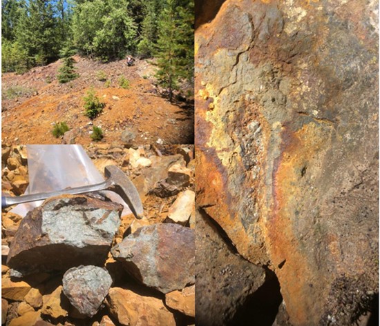 Figure 3. Oxidized dump material at Marshall Lake (Left) and sulphide mineralization associated with skarn at the Great Laxey showing (Right).