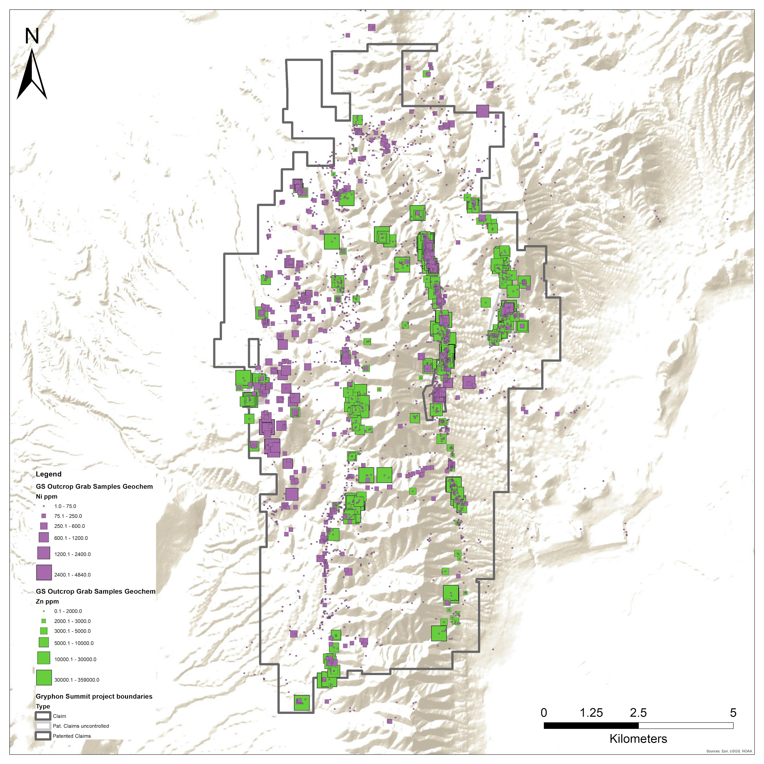 Figure 2: Anomalous geochemical results from outcrop and grab samples. Gold is yellow, Silver is blue, and Nickel is purple. Claim boundary delineated by the grey line. (Data generated/compiled by Golden Gryphon USA).