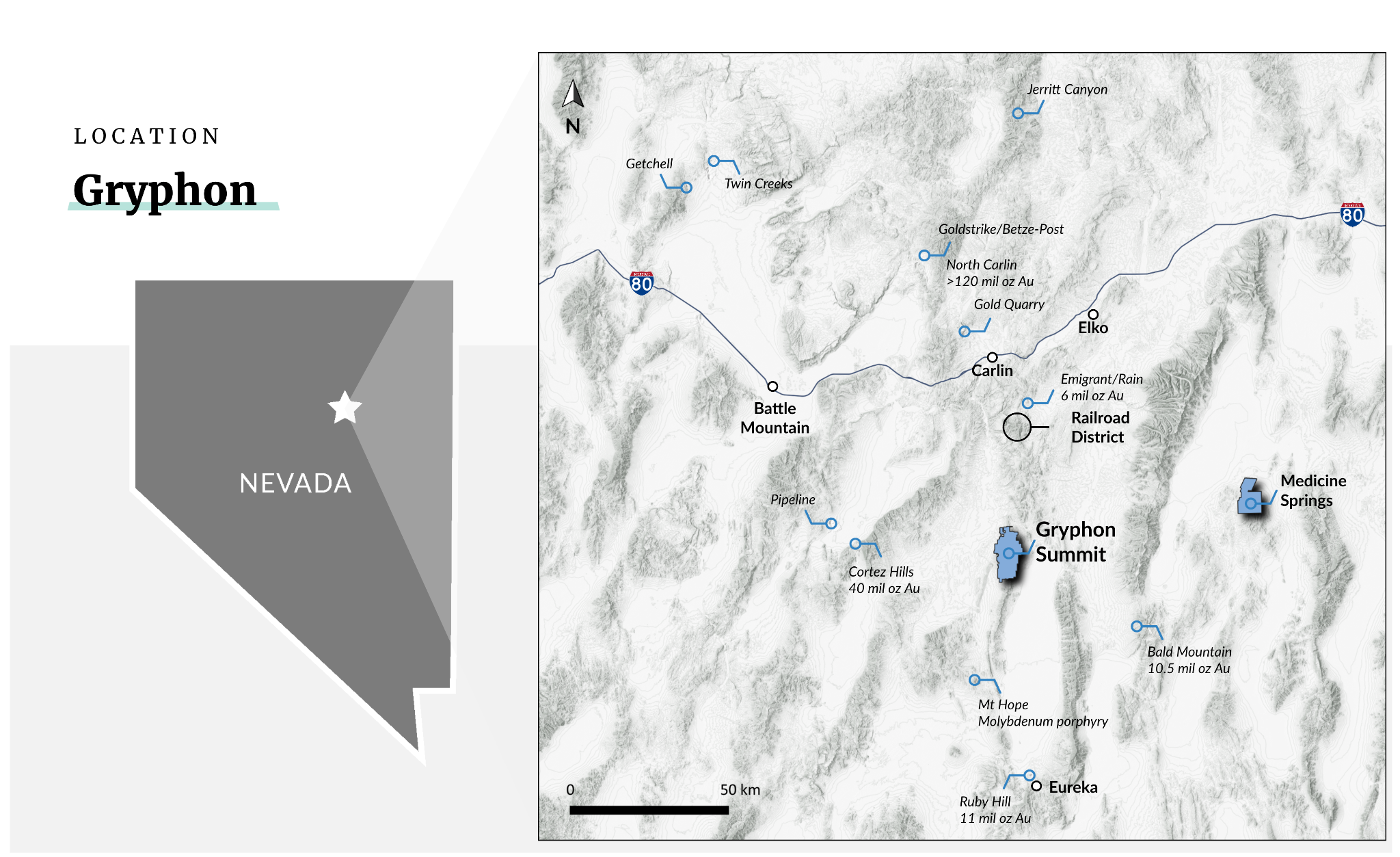 Figure 1. Gryphon Summit is located in Northeastern Nevada, 70 km NW of the Eureka district and 54 km from Carlin. The project is 73 km west of Reyna Silver’s Medicine Springs CRD Project.