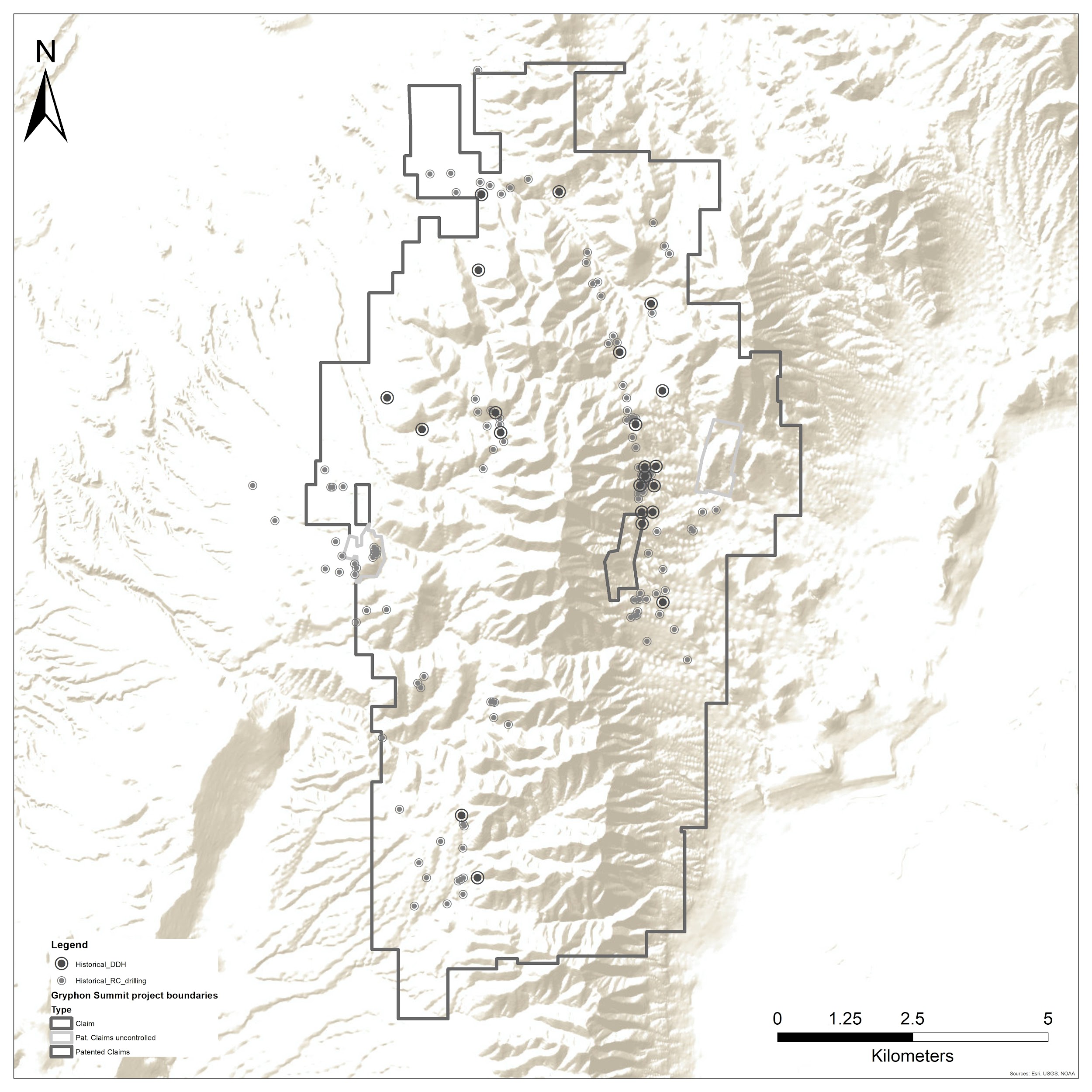 Figure 4. Historic Drilling at Gryphon. The previous drilling consisted of 133 RC holes displayed in grey and 23 Core holes displayed in dark grey. (Data generated/compiled by Golden Gryphon USA)