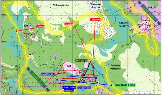 - Lower half of the CMH8350-001 intersected strongly altered diorite porphyry with pyrite-rich (5-15%) quartz stockwork veining. Diorite appears to be cut by an interpreted diatreme breccia to the west.