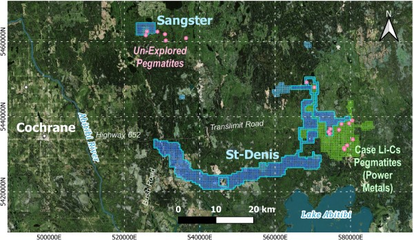 The St-Denis Project area is 26,373 hectares (including 24,036 hectares in the St-Denis Main block and 2,337 hectares in the Sangster block) and is one of the largest land holdings in the emerging Case Lake LCT (lithium-cesium-tantalum) pegmatite district of Northeastern Ontario. The property is strategically positioned over an ideal geological environment for pegmatite mineralization, as demonstrated by a number of observations of pegmatite in outcrop and drill core in the historic assessment work files and government mapping. The Project is supported by year-round ease of access, proximity to services and suppliers in the mining communities of Timmins and Cochrane, and location along strike to a known LCT (lithium-cesium-tantalum) pegmatite occurrence (Case Lake LCT pegmatite swarm).
