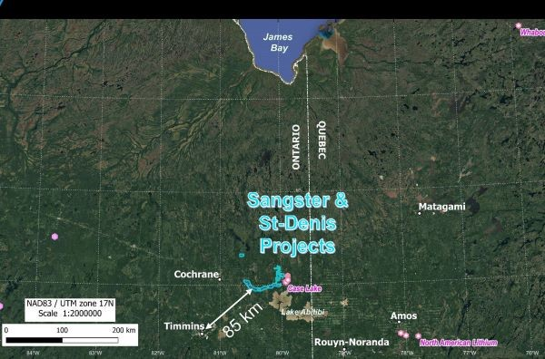 Figure 2: Map showing Sangster and St. Denis Projects in relation to James Bay and Timmins