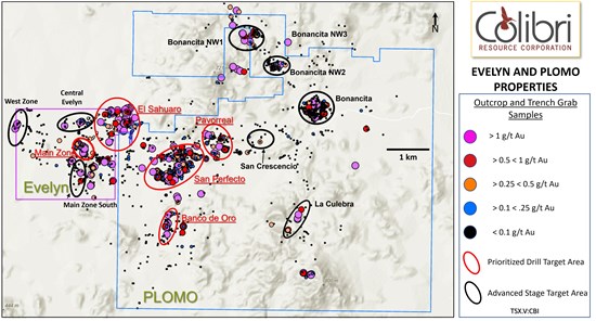 The Evelyn property was acquired by the Company in 2012 and the acquisition of the Plomo property was completed in March of 2023. On the Evelyn property, Colibri has completed comprehensive surface exploration including soil sampling, geological mapping and outcrop sampling, an airborne magnetic survey, and a property wide induced polarization survey. Since February 2020, Colibri has drilled a total of 12,333 metres (total of reverse circulation and core drilling) and is advancing mineralized zones at the Main Zone and El Sahuaro. On the Plomo property, the Company has compiled historical exploration data and has completed its first exploration program which included geological mapping and outcrop sampling at selected target areas on the property. The Company is continuing to advance its EP project-wide interpretation and exploration model and has identified 13 target areas with historical work that includes high grade grab samples from outcrop, high grade grab and channel samples from historical mine working, and drill intercepts that are both locally high grade and are consistent with grades being mined in the Caborca Gold Belt. The Company is prioritizing additional target areas on the EP property for drilling and is also planning further field work to evaluate and advance earlier stage targets and to comprehensively evaluate and explore the complete project area.