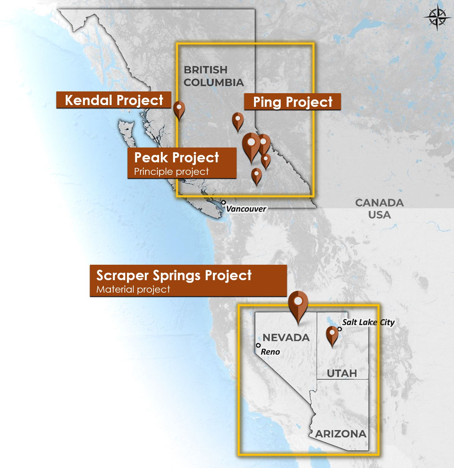 The Company holds a portfolio of eight 100% owned projects in British Columbia, Nevada, and Utah. Initial advanced exploration efforts will focus on the Peak and Ping South projects in central British Columbia where Red Canyon intends to commence drilling in Q4 2023. Additional high priority projects at Scraper Springs in northeast Nevada and Kendal in west central British Columbia are expected to advance to an initial drill stage in early to mid 2024.